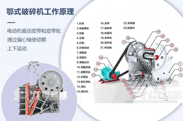 電動機驅(qū)動皮帶和皮帶輪,通過偏心軸使動鄂上下運動,當動鄂上升時肘板與動鄂間夾角變大,從而推動動鄂板向固定鄂板接近,與其同時物料被壓碎或劈碎,達到破碎的目的;當動鄂下行時,肘板與動鄂夾角變小,動鄂板在拉桿彈簧的作用下,離開固定鄂板,此時已破碎物料從破碎腔下口排出。隨著電動機連續(xù)轉(zhuǎn)動而破碎機動鄂作周期運動壓碎和排泄物料,實現(xiàn)鄂式破碎機的批量生產(chǎn)。